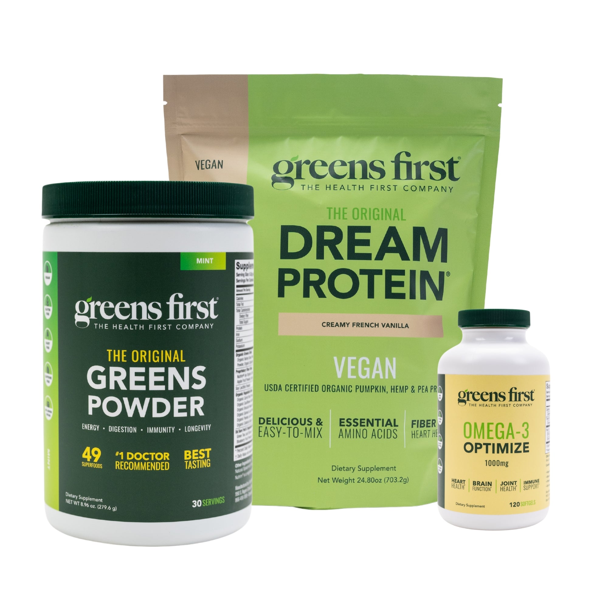 The Greens First Healthy Living Shake is made by mixing your favorite flavor of Greens First and your preferred Dream Protein together in 10-12 oz. of pure, cold water. Shake it up and drink it along with one serving of Omega-3 First or Ahiflower Oil softgels.
